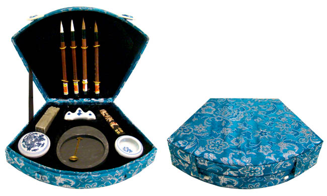 Calligraphy is a traditional Chinese art and a quintessence of Chinese culture. It demonstrates Chinese character's unique artistically glamour by means of composition, structure, and stroke. This wonderful boxed set includes soapstone signature chop, little ceramic paint pot containing red ink, gold floral design peg of hard black ink, heavy stone mixing palette and four Chinese bamboo brushes with fine bristles. A white porcelain brush rest and small porcelain mixing bowl are also included. Made from 100% fine Chinese silk.